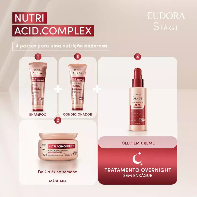 O Shampoo Siàge Nutri Acid.Complex realiza uma limpeza profunda e nutrição intensa para cabelos ressecados. Devolve a vitalidade e o brilho dos fios. Formulado com blend de ácidos e óleos, prepara os fios para o tratamento, garantindo nutrição desde a lavagem.