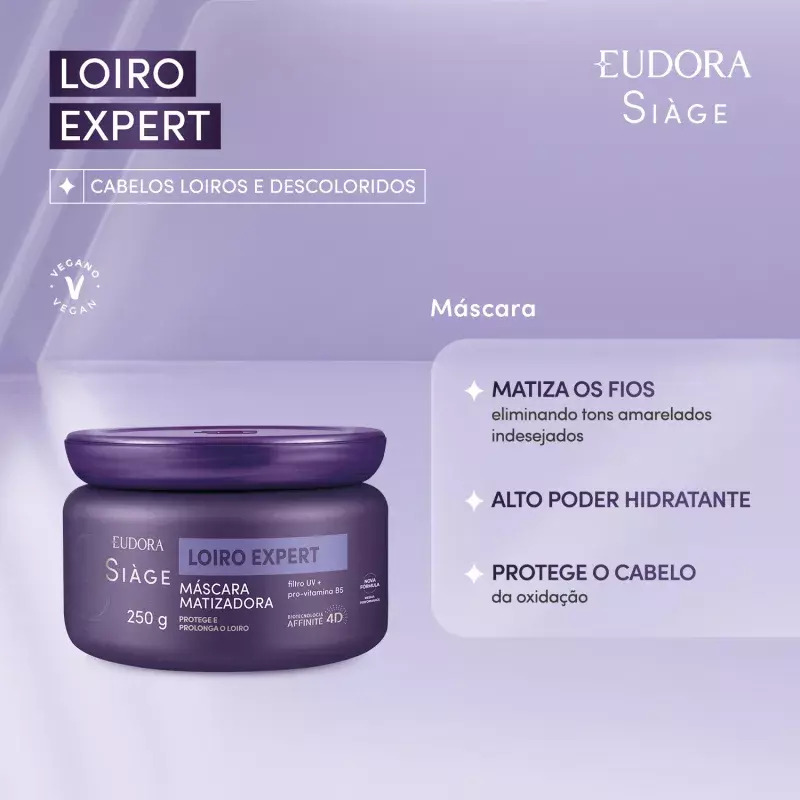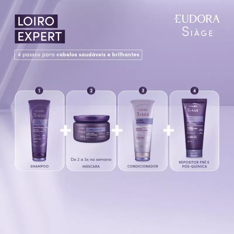 Uma linha completa de tratamento para quem desejar ter seus loiros iluminados e protegidos. Proporcionando mais brilho e proteção desde a primeira aplicação, Siàge oferece por meio do Loiro Expert uma cor intensa e radiante por muito mais tempo. Perfeita para cabelos com luzes, mechas ou tingidos, essa linha completa une alto poder antioxidante e hidratação para preservar a cor de cada um dos seus fios.