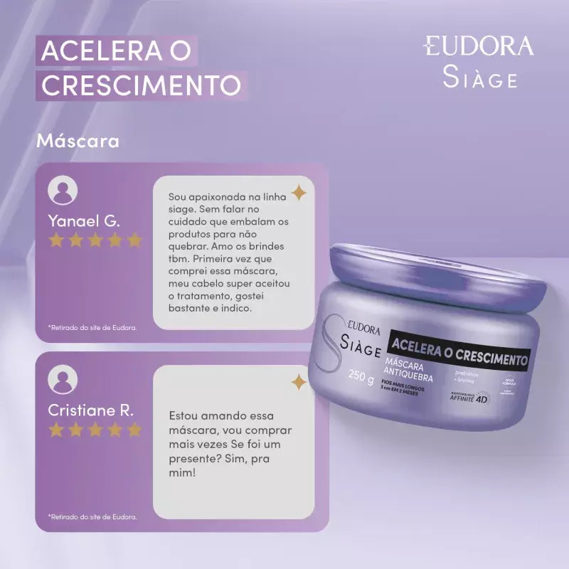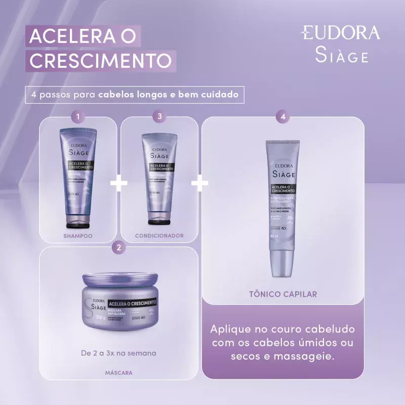 Estimulando o crescimento saudável dos cabelos, a linha Siàge Acelera o Crescimento de Eudora é ideal para cabelos com dificuldade de crescimento. Com atuação no equilíbrio do couro cabeludo, além de ativar o crescimento dos fios, previne a queda e prolonga a vida dos fios!